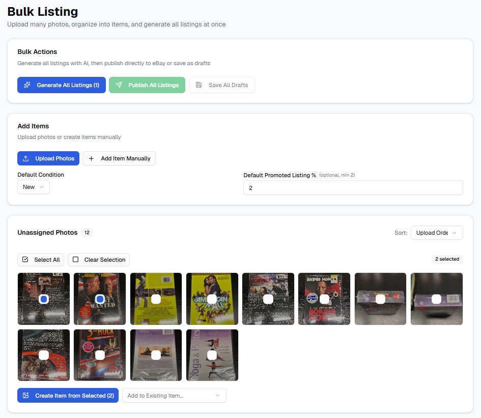 Create lots, upload photos, and let AI write the title and description for each.